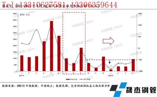 那么,預(yù)判今年用鋼情況的話,可以參考從2021年-2022年4月份以來的50家代表房企每月拿地總額數(shù)據(jù),假如往前倒推6個(gè)月,2022年1月起的房地產(chǎn)用鋼情況大致可以參照2021年7月起的拿地?cái)?shù)據(jù),因?yàn)樗⒎且灰粚?yīng)的關(guān)系。我們可以看到,從2021年10月以來的拿地?cái)?shù)據(jù)不容樂觀,單月同比跌幅持續(xù)低于-50%水平線以下,預(yù)示接下來三季度的房地產(chǎn)新開工以及其用鋼情況理論上應(yīng)該是很差的。