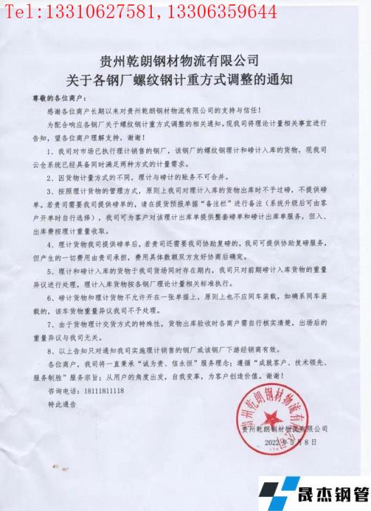 免責聲明:本網站(山東聊城晟杰無縫鋼管廠www.vsocial.cn)刊載的“貴州乾朗鋼材_無縫鋼管物流有限公司關于各無縫鋼管廠家螺紋鋼計重方式調整的通知”等均源于網絡,版權歸原作者所有,且僅代表原作者觀點,本文所載信息僅供參考。轉載僅為學習與交流之目的,如無意中侵犯您的合法權益,請及時聯系刪除。本網站刊登此篇文章并不意味著本站贊同其觀點或證實其內容的真實性,我們不對其科學性、嚴肅性等作任何形式的保證。如果侵犯了您的版權,請盡快聯系我們予以撤銷,謝謝合作!