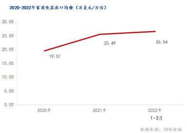 2022年一季度中國(guó)家用電器出口均價(jià)為26.54萬(wàn)美元/萬(wàn)臺(tái),2021年一季度家用電器出口均價(jià)為25.83萬(wàn)美元/萬(wàn)臺(tái)。