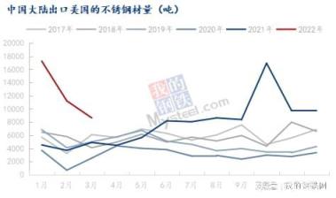 2021年,中國大陸出口美國的不銹鋼制品的量總計(jì)22萬噸(占大陸出口總量的20.3%),2022年1-3月,該量約5.2萬噸(占大陸出口總量的22.3%),同比增加6.8%。
