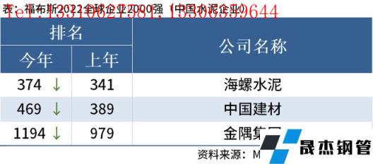免責聲明:本網站(山東聊城晟杰無縫鋼管廠www.vsocial.cn)刊載的“中國3家水泥企業上榜福布斯2022全球企業2000強”等均源于網絡,版權歸原作者所有,且僅代表原作者觀點,本文所載信息僅供參考。轉載僅為學習與交流之目的,如無意中侵犯您的合法權益,請及時聯系刪除。本網站刊登此篇文章并不意味著本站贊同其觀點或證實其內容的真實性,我們不對其科學性、嚴肅性等作任何形式的保證。如果侵犯了您的版權,請盡快聯系我們予以撤銷,謝謝合作!