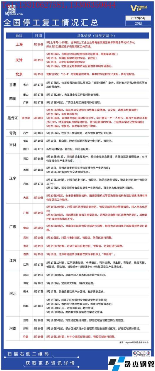 免責聲明:本網站(山東聊城晟杰無縫鋼管廠www.vsocial.cn)刊載的“疫情影響丨全國停工復工情況匯總(5月20日)”等均源于網絡,版權歸原作者所有,且僅代表原作者觀點,本文所載信息僅供參考。轉載僅為學習與交流之目的,如無意中侵犯您的合法權益,請及時聯系刪除。本網站刊登此篇文章并不意味著本站贊同其觀點或證實其內容的真實性,我們不對其科學性、嚴肅性等作任何形式的保證。如果侵犯了您的版權,請盡快聯系我們予以撤銷,謝謝合作!