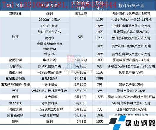 據(jù)不完全統(tǒng)計(jì),截至5月20日,國(guó)內(nèi)13家無縫厚壁鋼管廠家發(fā)布檢修計(jì)劃。其中,中天鋼鐵因一座轉(zhuǎn)爐檢修,坯料不足,兩條棒材線停產(chǎn)檢修,預(yù)計(jì)5月份影響棒材產(chǎn)量4.5萬噸。
