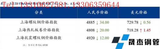 5月23日普鋼絕對價格指數變化:綜合指數5094.32,下跌8.39;螺紋鋼指數4842.56,下跌9.26;線材指數5239.01,下跌5.27;熱軋板卷指數4888.7,下跌13.55;冷軋板卷指數5396.14,下跌4.01;中厚板指數5104.15,下跌8.67。