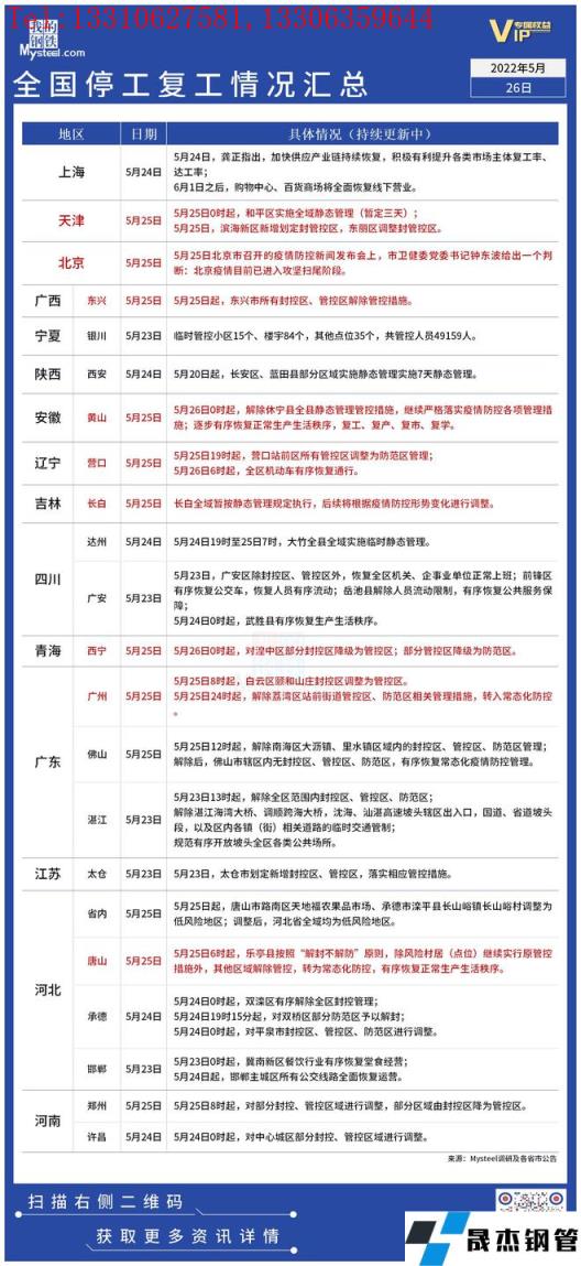 免責聲明:本網站(山東聊城晟杰無縫鋼管廠www.vsocial.cn)刊載的“疫情影響丨全國停工復工情況匯總(5月26日)”等均源于網絡,版權歸原作者所有,且僅代表原作者觀點,本文所載信息僅供參考。轉載僅為學習與交流之目的,如無意中侵犯您的合法權益,請及時聯系刪除。本網站刊登此篇文章并不意味著本站贊同其觀點或證實其內容的真實性,我們不對其科學性、嚴肅性等作任何形式的保證。如果侵犯了您的版權,請盡快聯系我們予以撤銷,謝謝合作!