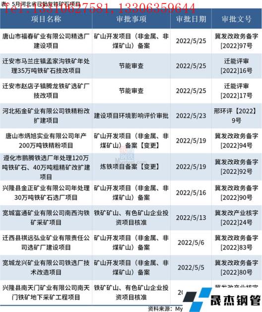 據(jù)不完全統(tǒng)計,2022年5月河北省共批復鐵礦石相關項目11個。其中,有5個礦山開發(fā)項目備案(變更),2個鐵礦石技改項目節(jié)能審查,2個鐵礦礦山投資項目核準,1個鐵精粉擴建項目環(huán)境影響評價審批和1個煉鐵項目備案(變更)。