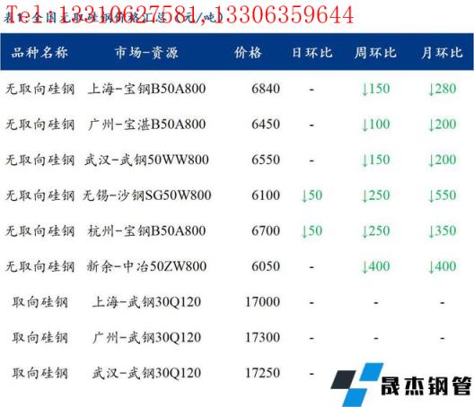 無錫市場:無錫無取向硅鋼價格跌50元/噸,800系寶鋼6850元/噸、武鋼6550元/噸、沙鋼6100元/噸、鞍鋼6300元/噸,市場成交偏弱。據商戶反饋,近期來國內鋼市震蕩下行,市場預期偏悲觀,電機下游行業接單情況偏差,多觀望為主;另外當地貿易商多暗降拋貨為主,且多倒掛嚴重,更多關注近期無縫厚壁鋼管廠家調價政策以及無縫厚壁鋼管廠家追補情況。綜合來看,預計明日無錫市場硅鋼現貨多震蕩趨弱運行