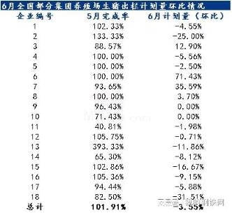 據(jù)農(nóng)產(chǎn)品調(diào)研了解,針對18家集團(tuán)養(yǎng)殖場全國生豬出欄情況來看,5月生豬出欄完成率總計101.91%,6月出欄量較5月實際出欄量環(huán)比下跌3.55%。