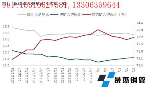 自今年春節(jié)開始,無縫厚壁鋼管廠家高爐中粉礦、塊礦、球團入爐配比變化趨勢明顯。截至5月27日, 64 家無縫厚壁鋼管廠家燒結礦配比73.2%,環(huán)比1月29日增加2.2個百分點,同比去年同期增加1.8個百分點;塊礦入爐比例11.7%,環(huán)比春節(jié)期間下降1.1個百分點,同比降0.3個百分點;球團入爐配比15.2%,環(huán)比亦下降1.1個百分點,同比降1.4個百分點。