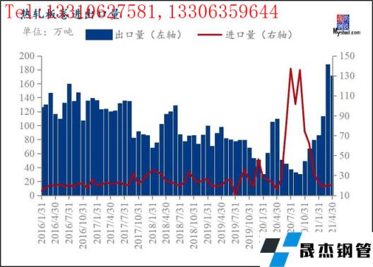 就目前來看,近期熱卷出口量暴增主要是因為2至4月份大批量出口單簽訂,并開始陸續發貨,因此4-6月份出口量或將繼續攀升,但從近期出口市場訂單簽訂情況來看,我國熱軋板卷出口或將在7月份開始減量。