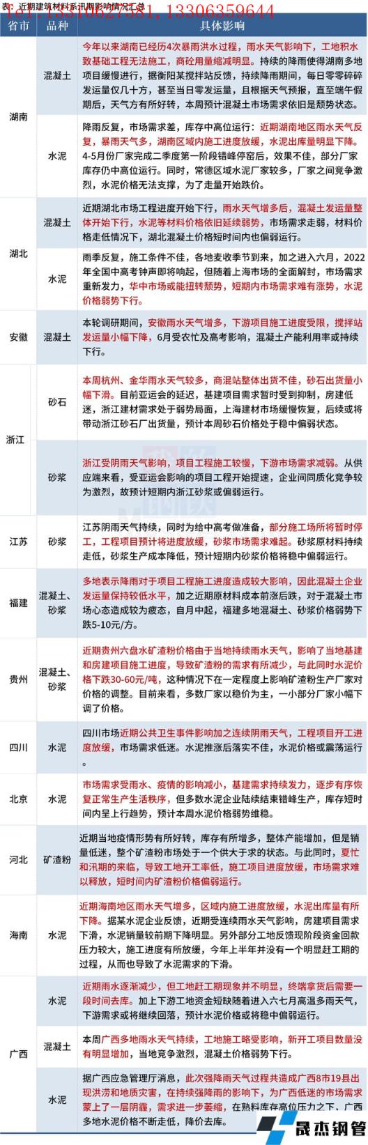 截至6月6日,據(jù)百年建筑網(wǎng)調(diào)研,華中、華東、西南、華南等12省市建材市場和建筑工地進度受到明顯影響。短期來看隨著部分省份農(nóng)忙和大規(guī)模雨水天氣預報來臨,部分材料整體增量仍然有限,下游市場需求受到一定抑制,市場進入需求淡季,端午節(jié)前后價格隨之出現(xiàn)下跌情況。具體情況如下: