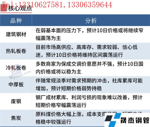 熱軋板卷:6月9日,全國24個主要城市4.75mm熱軋板卷均價4910元/噸,較上個交易日上漲1元/噸。現貨市場早盤報價小幅上漲,漲后市場成交一般,午后盤面反復,現貨價格小幅走弱,整體成交依然偏弱,需求恢復較慢,庫存仍在累積,市場心態承壓。整體來看,目前盤面與現貨走勢稍有背離,陷入“強盤面弱現貨”局面,高供應、高庫存和較弱的需求和低迷的信心是造成上述情況的主要因素,市場目前確實有在進行自我修復,但不管是信心的樹立還是需求的回升都仍然需要時間,而近期市場熱議的限產也確實對現貨帶來一定支撐,但相應的原料走弱也會導致成材成本位下移成材價格被動跟隨,所以短期市場價格仍在博弈中維持震蕩,價格持續維持仍需注意變現和風險累積,另外本周熱軋產量增加13.80萬噸,廠庫下降2.51萬噸,社庫增加9.21萬噸。綜合來看,預計10日熱軋價格仍將維持區間震蕩運行。