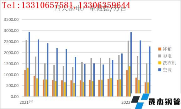 2022年4月份,冰箱產(chǎn)量652.4萬臺,同比下降15.8%;彩電產(chǎn)量1512.7萬臺,同比增長1.5%;洗衣機產(chǎn)量649.9萬臺,同比下降15.8%;空調(diào)產(chǎn)量2279.2萬臺,同比下降4.0%;