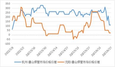 圖3 2022年杭州-唐山、沈陽-唐山焊管價(jià)差走勢圖