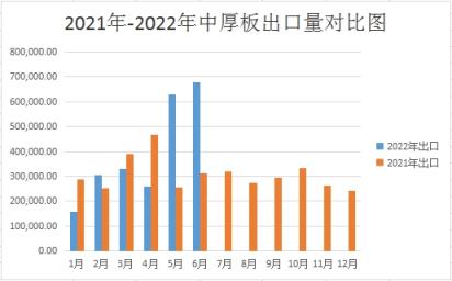 至于出口方面,據不完全統計,2022年6月份國內中板出口量約為67.94萬噸,環比5月份出口量增加約8.1萬余噸,與2021年同期相比出口量增加約36.59萬噸左右,從圖中可見,中厚板品種出口量繼續增長,由于國內市場不景氣,加之價格相較國外處于低谷,因此出口份額與往年同期相比有明顯增加。