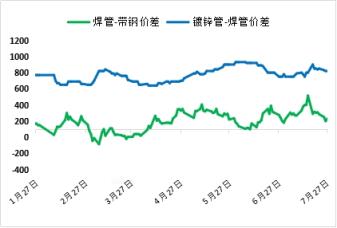 7月焊管較帶鋼價差,鍍鋅管較焊管價差走勢趨于一致。月中階段走擴后,價差空間再次收窄,月末焊管與原料價差收窄幅度大于鍍鋅管。目前管廠廠內原料輪換周期拉長至20天左右,部分規格拉長至1個月之久,月內出現停購原料3-5天的情況。結算周期內焊管生產利潤平均盈利29元,架子管平均虧損7元;鍍鋅管較焊管價差收縮91元,管企綜合生產利潤改善不明顯。