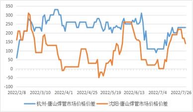 圖3 2022年杭州-唐山、沈陽-唐山焊管價差走勢圖