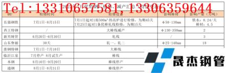 7月份無縫鋼管廠家出廠價(jià)格大幅下調(diào)。無縫鋼管廠家盈利情況仍不理想,整體厚壁鋼管出庫困難,無縫鋼管廠家多以虧損為主,在資金壓力較大情況下,有意打壓原料價(jià)格,當(dāng)前無縫鋼管廠家對(duì)原料的采購積極性一般。近期無縫鋼管廠家考慮到廠庫居高不下,成本明顯虧損的情況下,各無縫鋼管廠家紛紛安排檢修減產(chǎn),具體檢修情況如下:
