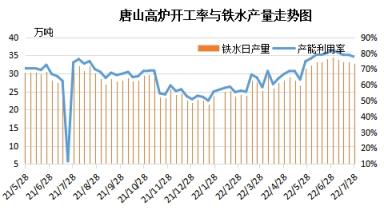 據網調研數據顯示:截至7月28日,唐山區域高爐產能利用率70.21%,環比上月下跌8.68個百分點;鐵水日均產量較上月減少約1.7萬噸。