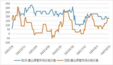 圖3 2022年杭州-唐山、沈陽-唐山焊管價差走勢圖